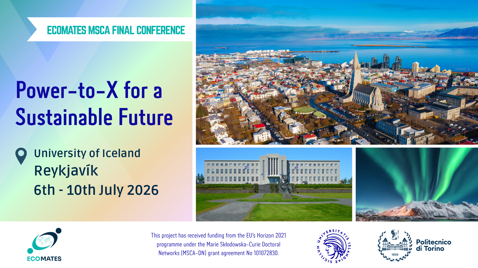 We are pleased to announce the ECOMATES Final Conference, "Power-to-X for a Sustainable Future", which will take place from 6th to 10th July 2026 at the University of Iceland in Reykjavík (Iceland).